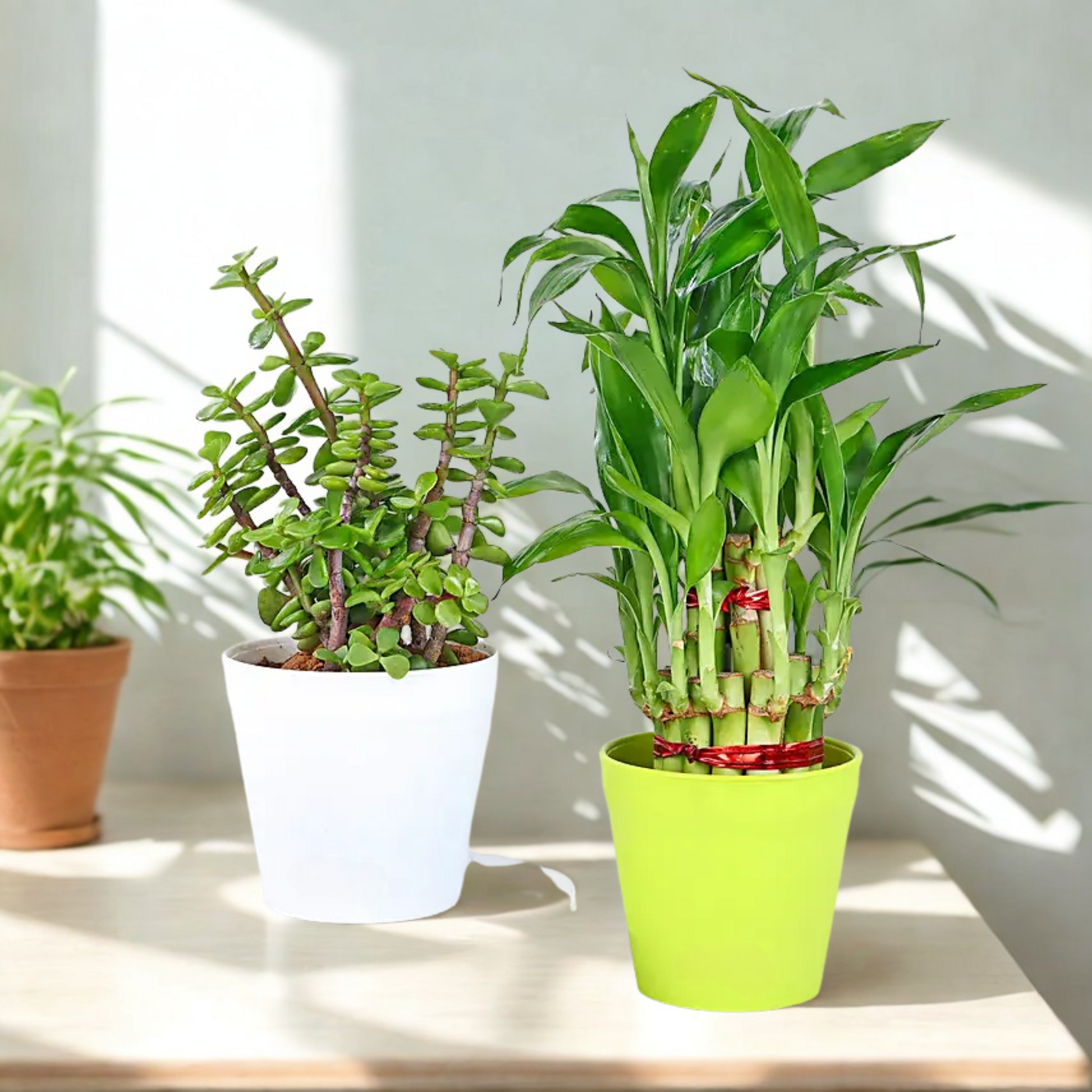 The Bamboo & Jade Plant Set combines two resilient and meaningful plants. The Jade Plant, a perennial succulent, thrives with minimal care and blooms delicate pink or white flowers in spring, adding subtle beauty to any space. Paired with the Lucky Bamboo, whose two-layered stalks symbolize love and are believed to double your luck, this set offers both aesthetic appeal and positive energy. Ideal for enhancing your home or office environment with natural charm and auspicious symbolism.