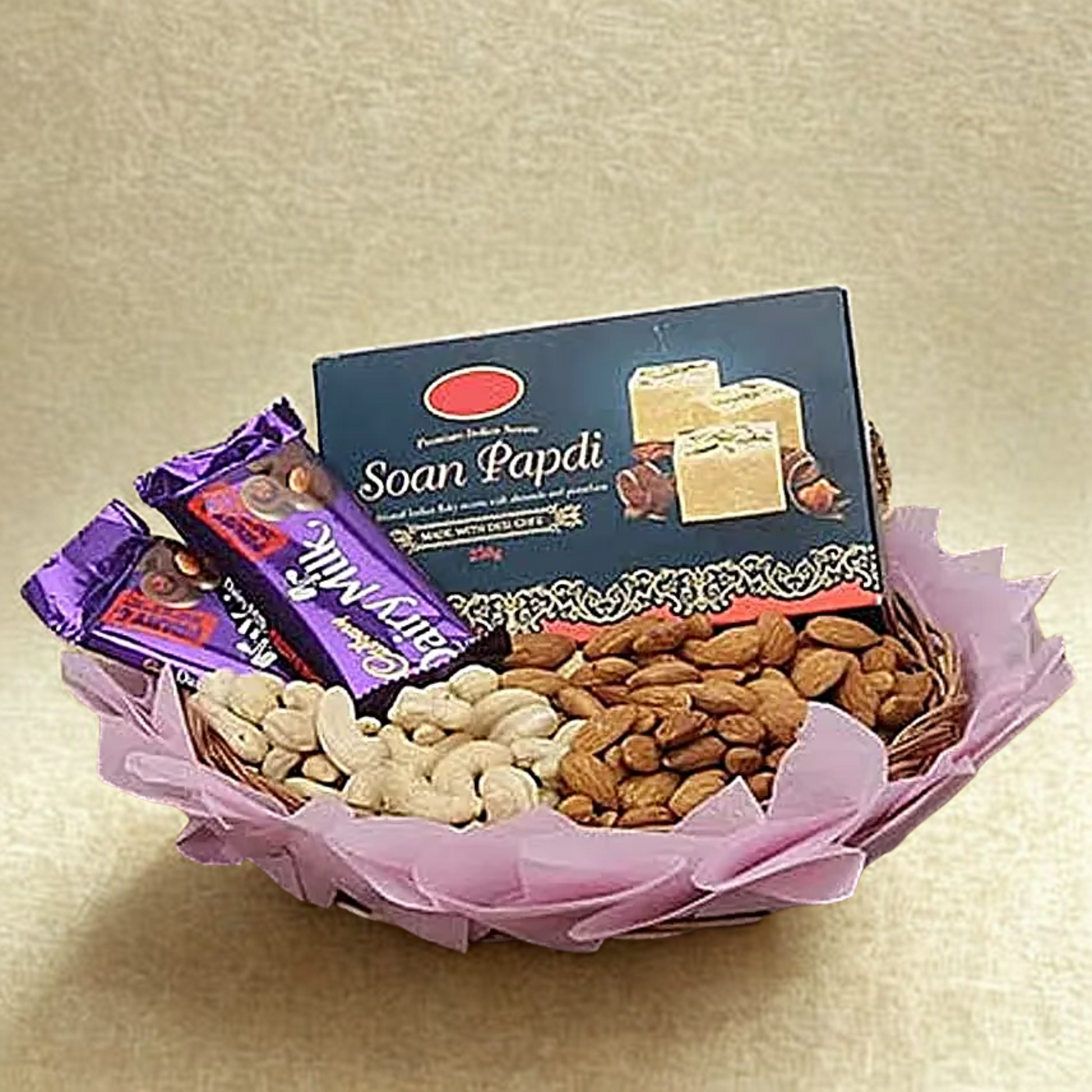 Celebrate Diwali with the "Basking In Glory" gift set, thoughtfully curated to delight your loved ones. This elegant cane basket (17.78 cm diameter) includes 100g each of premium almonds and cashew nuts, two 36g Cadbury Fruit Nut chocolates, and 450g of traditional soan papdi. Weighing approximately 1 to 1.5 kg and measuring about 1x1 feet, this vegetarian assortment features carefully selected ingredients with natural and artificial flavorings. Please note it contains wheat, milk, sesame, soy, and may contain nuts. A perfect festive gift to convey your warm wishes with quality and taste.
