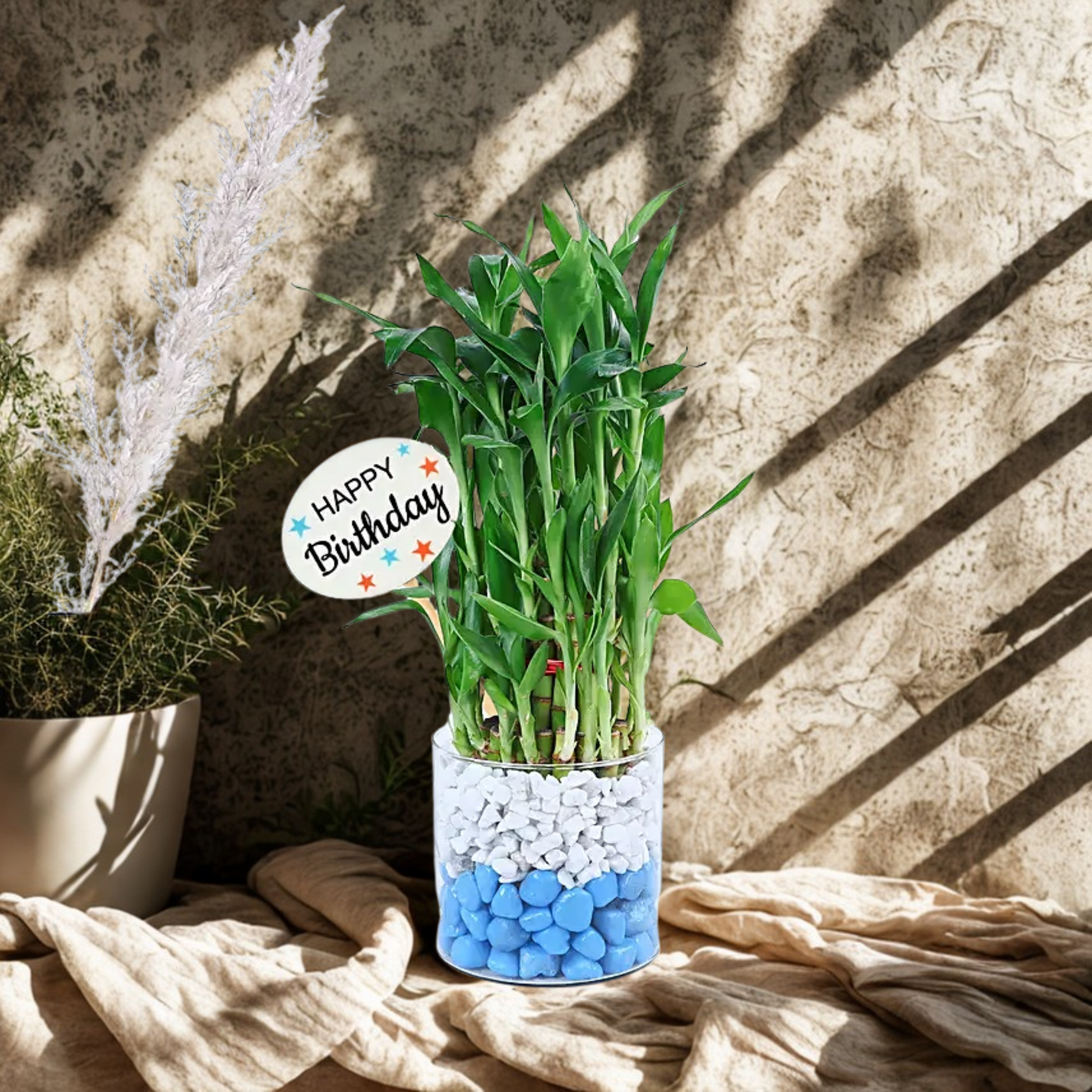 Supercharge birthday bliss with our Two-Layer Bamboo Plant Arrangement—a living emblem of prosperity and growth! Nestled in a chic glass vase with snow-white pebbles and topped with a cheery "Happy Birthday" sign, this green wonder is a symbol of balance and good fortune. It's a heartfelt gift that sprinkles positivity for the year ahead.